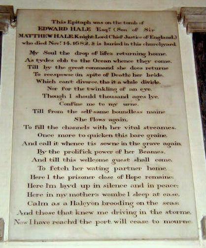 HALE, (Sir) Matthew, 1s. robert, of Alderly, co. Gloucester, ar,. MAGDALEN HALL, matric. 20 Oct., 1627, aged 16; bar.-at-law, of Lincoln's Inn, 1636, bencher 1649, serjeant-at-law 1654, M.P. co. Gloucester 1654-5 and 1660, Oxford University 1659-60, justice common pleas 1654-8, chief baron 1660-71, knighted 30 Jan., 1661, chief justice king's bench 1671, until his death 25 Dec., 1676, aged 67. See Foss' Judges; Foster's Parliamentary Dictonary; Ath iii. 1090; & D.N.B.