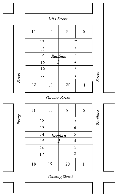 The town was set out in a grid fashion of numbered Sections, each Section containing 20 Blocks, each Block being an area of two roods (see Appendix M). The first Sections sold were Sections 2 and 3, and consequently contain some of the oldest buildings in the town, and naturally Gawler Street became the first town centre. The town continued to develop from these beginnings,